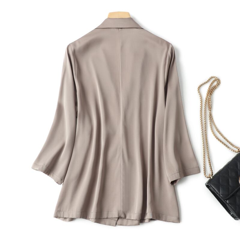 このスモールシルクスーツジャケットは、女性にぴったりの薄型スタイルです。