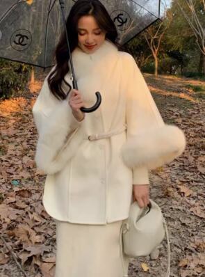 白いウールコートに大きな毛皮の襟が特徴の、ヘップバーンスタイルのウールケープジャケットです。