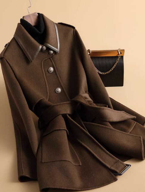 2023年春秋新作両面カシミヤコートレディースミドル丈スクエアカラーシングルブレストミリタリーワークウェアウールウールジャケット