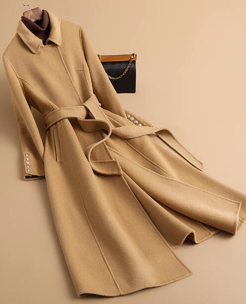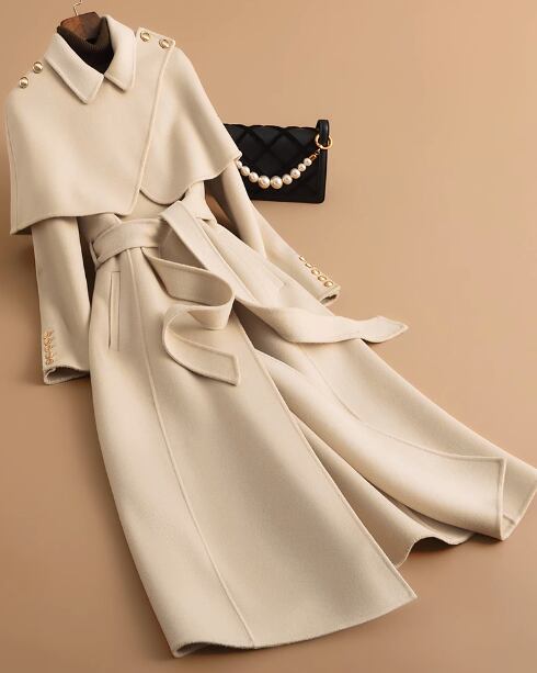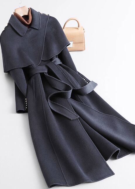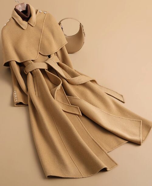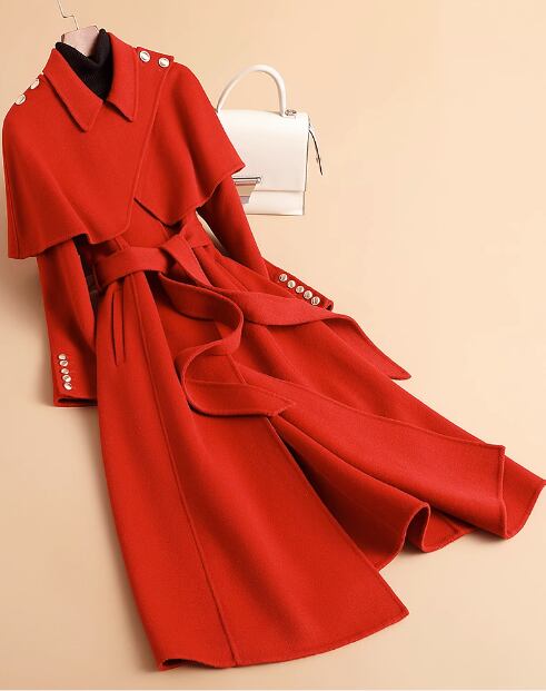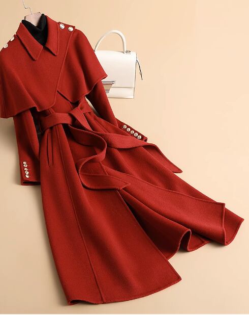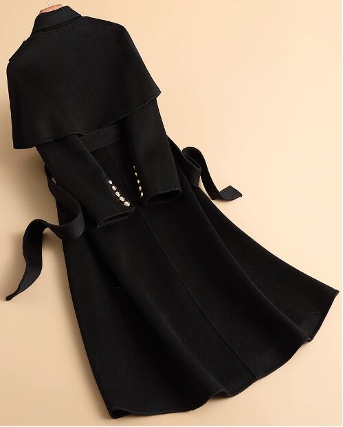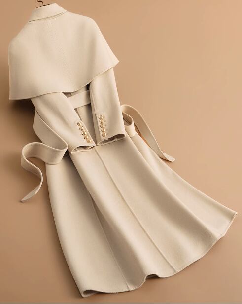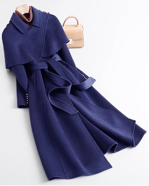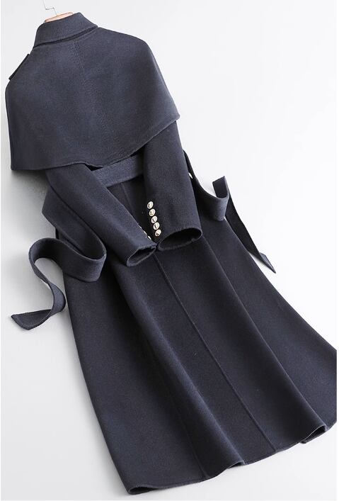 2023 秋冬新作両面カシミアコートレディースミドル丈ヘップバーンスタイルケープ着脱式ウールコート