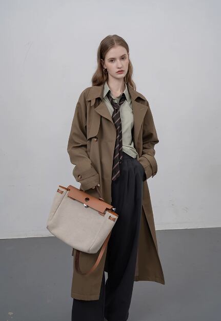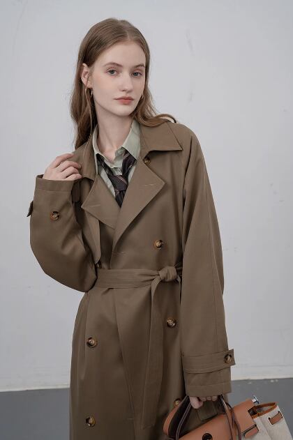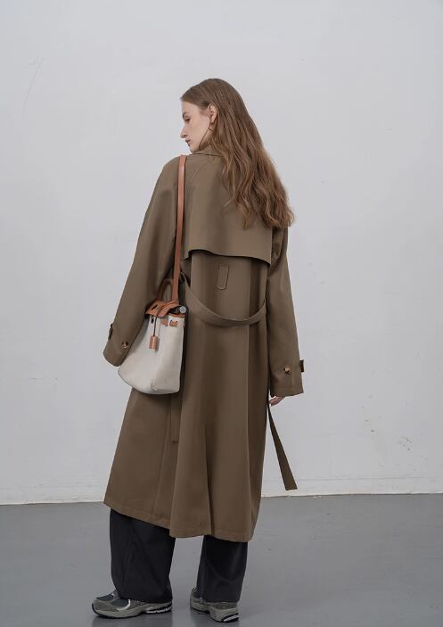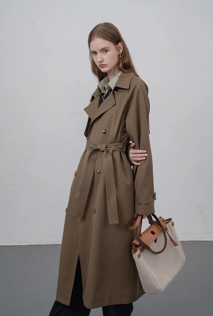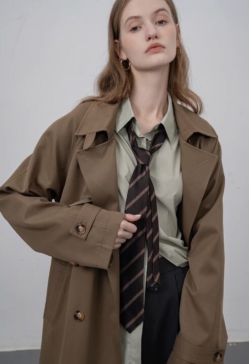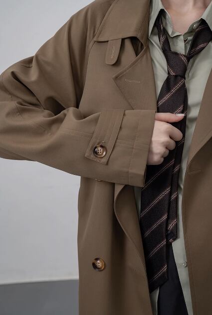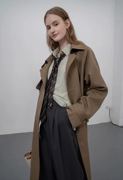 豪華なデザインにもかかわらず、このコートはカジュアルな着こなしにぴったり。プチミドル丈のデザインは、スタイルを引き立てるだけでなく、脚長効果もあります。カーキ色のトレンチは、さまざまなコーディネートに合わせやすく、季節感も演出できます。