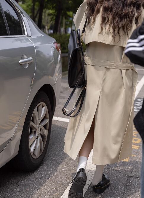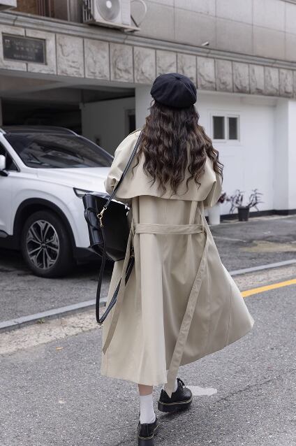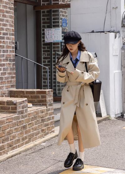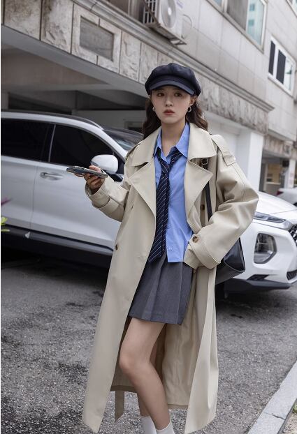 カーキ色のトレンチコート、女性用の秋気質、豪華なブリティッシュスタイル、プチトップ、ミドル丈のコート