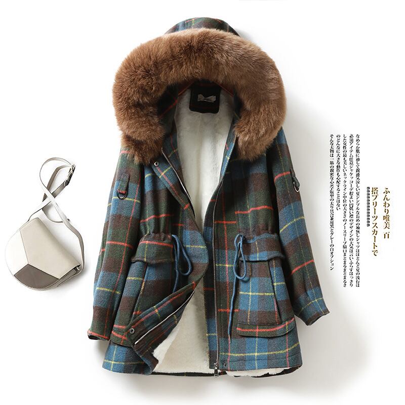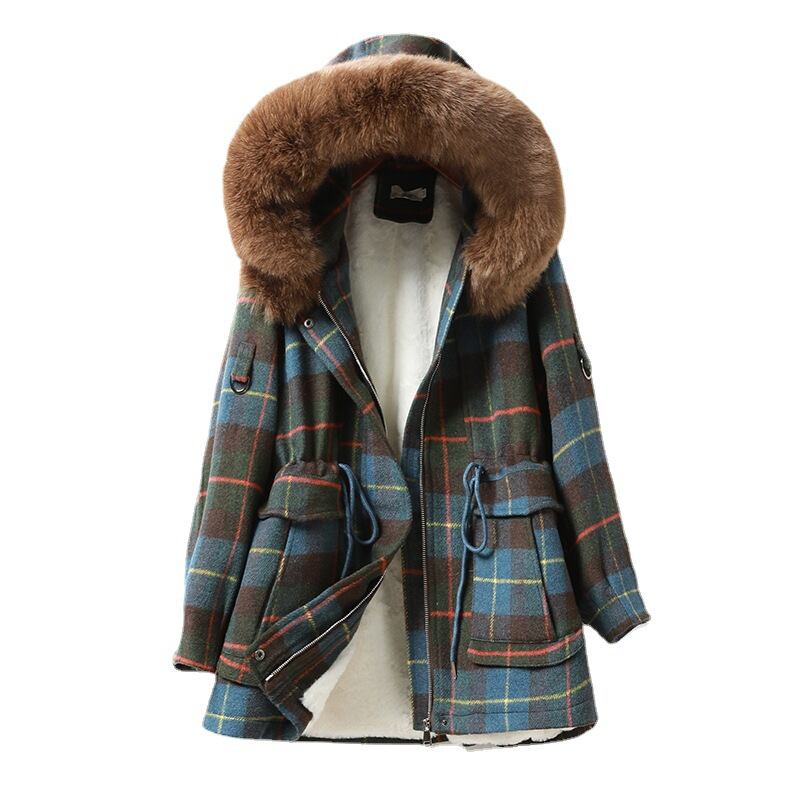 ショッピングモールでは、高級ラベルカット、外国商標、冬用フード付き、大きな毛皮の襟、ベルベットのチェック柄のウエストが付いたパッド入りジャケット