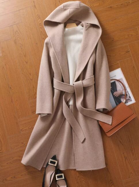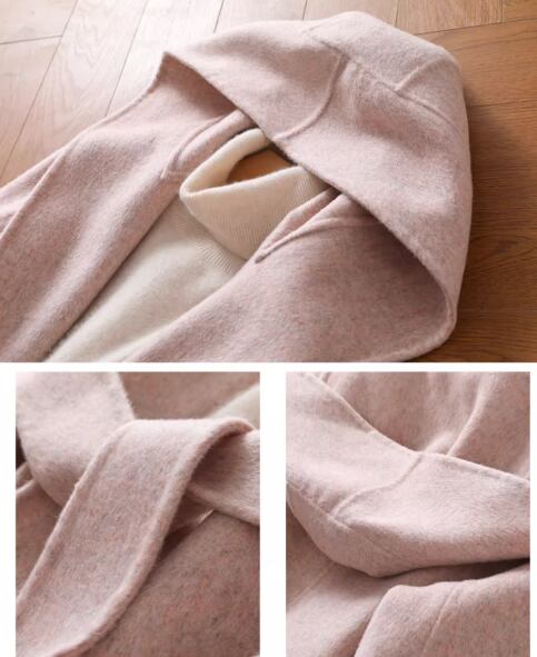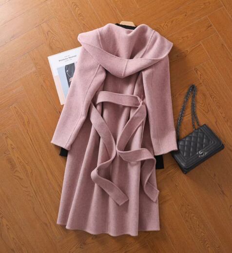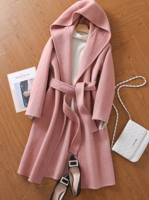 秋冬服、新作両面カシミヤコート、女性用フード付き、ロングウールコート、厚手、膝上、両面、アウター