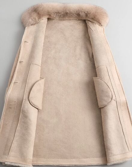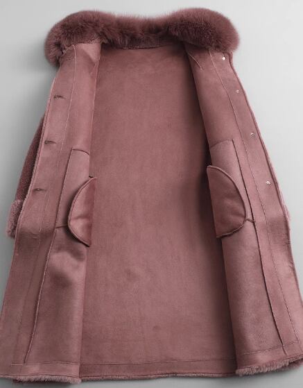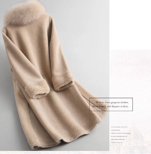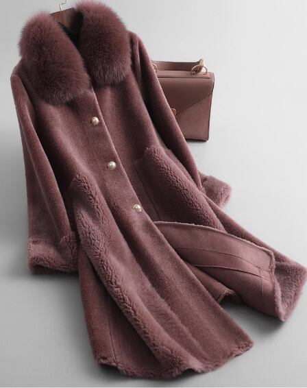 シープフリースコート、グレインフリース、オールインワン、ミドルレングスのフォックスファーカラー、女性用ファージャケット2023年新品