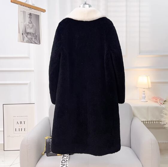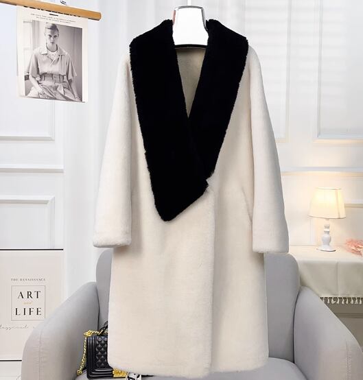 2023年新作白黒コントラストカラービッグカラーラムファーオールインワンジャケットレディースロングシープスキンファーコート