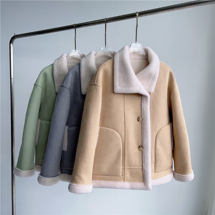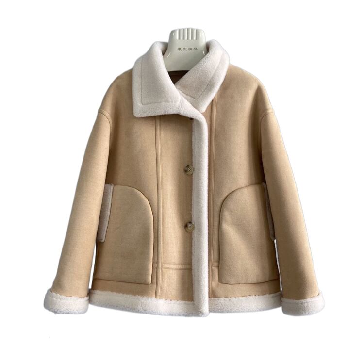 ウィンターラペルスエードファージャケット、モーターサイクルショーツ、コンポジットファー、オールインワン、レディース、ルーズフィット、シープフリースデザイン、スタイリッシュ