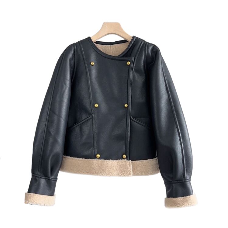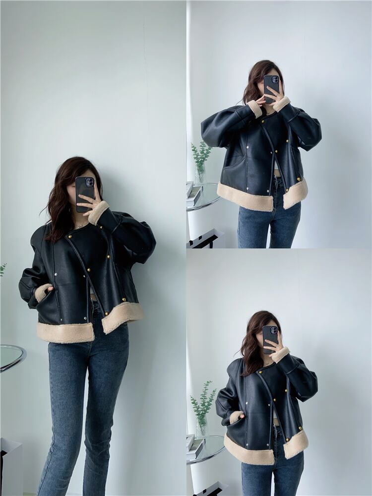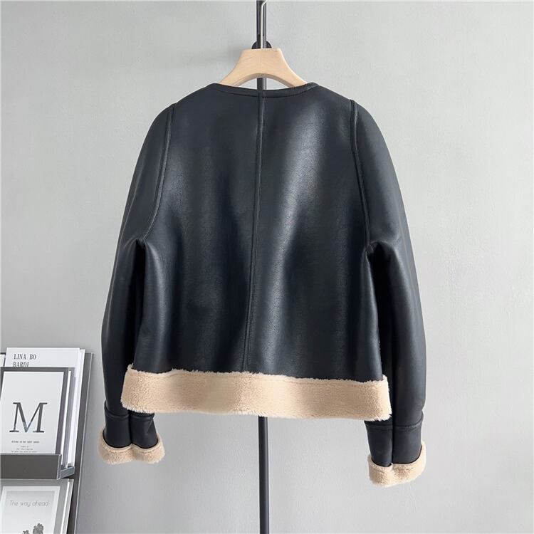 新しいオートバイイミテーションナッパレザーコンポジットファーオールインワンレディースジャケット2023ショートシープスキンファージャケットシックウィンター