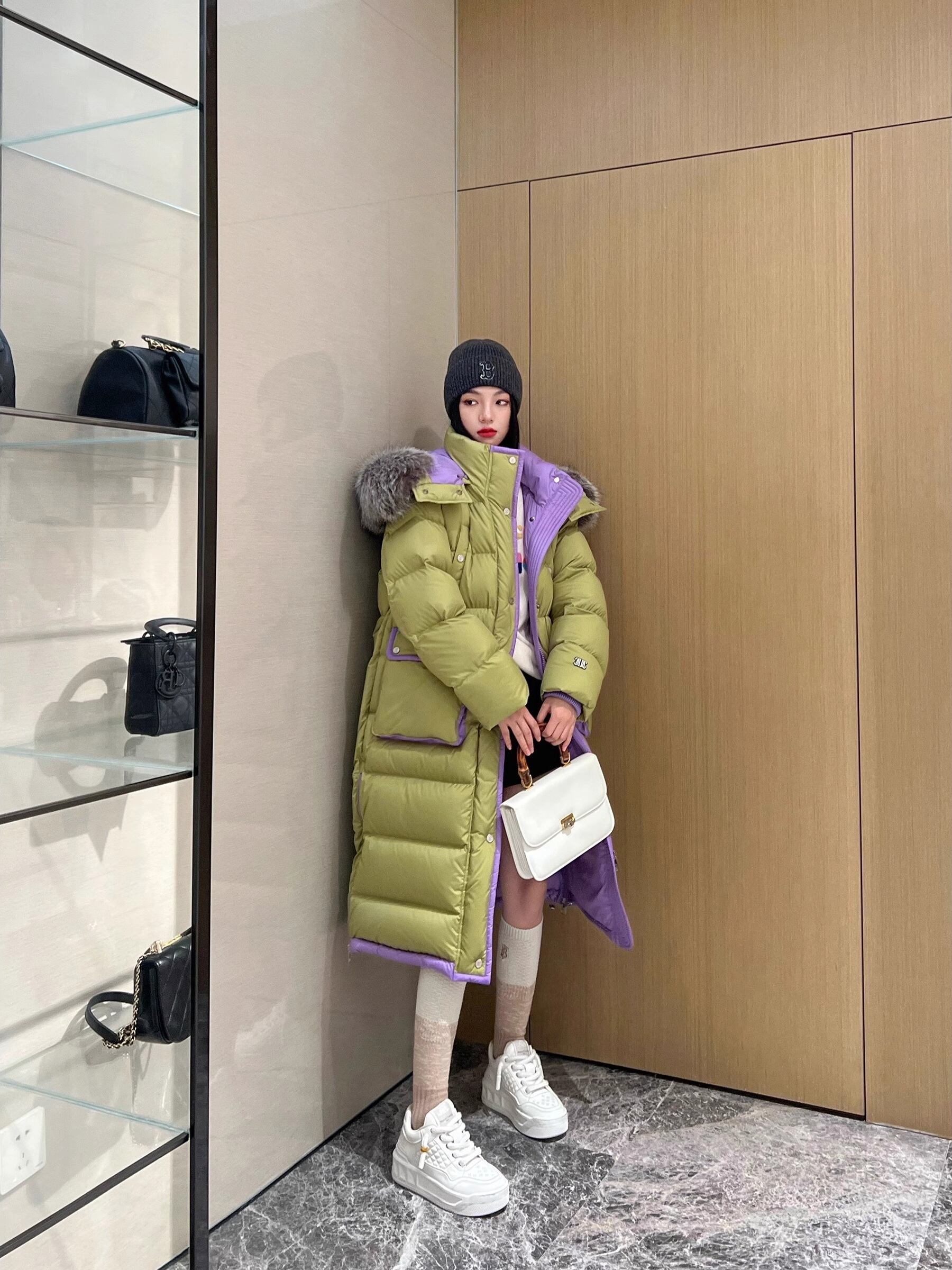 シャオジンジアと同じ防寒アーティファクト!グレード95のホワイトグースダウン、オーバーサイズのシルバーフォックスカラー、コントラストボーダー、ロングダウンとショートダウン