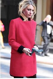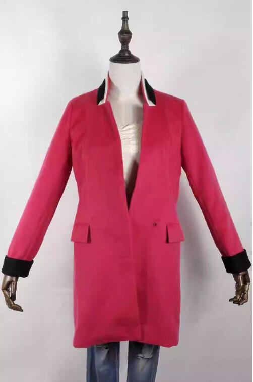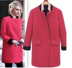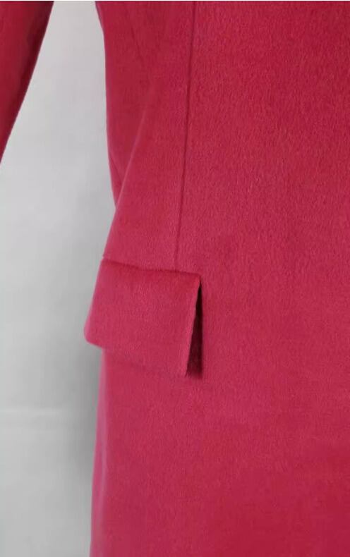 秋冬ローズレッドコート欧米ファッション長袖配色襟ミドル丈両面ベルベット薄手ウールジャケット女性用
