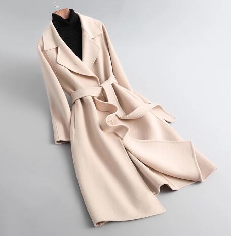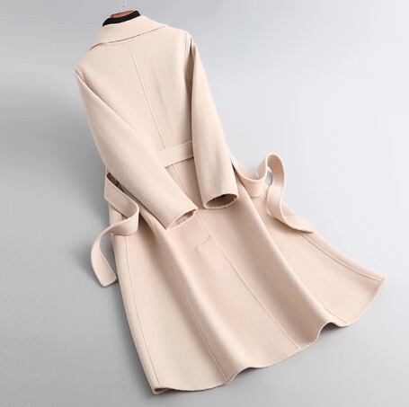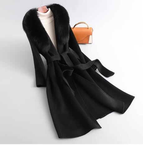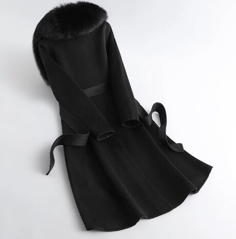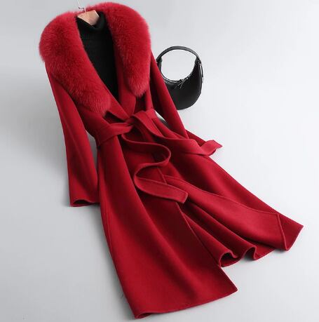 2023スリムニュー両面ウールカシミアコート、女性用ミドルレングス、リアルフォックスファーカラー、ウールジャケット、ウエストバンド、スリムフィット