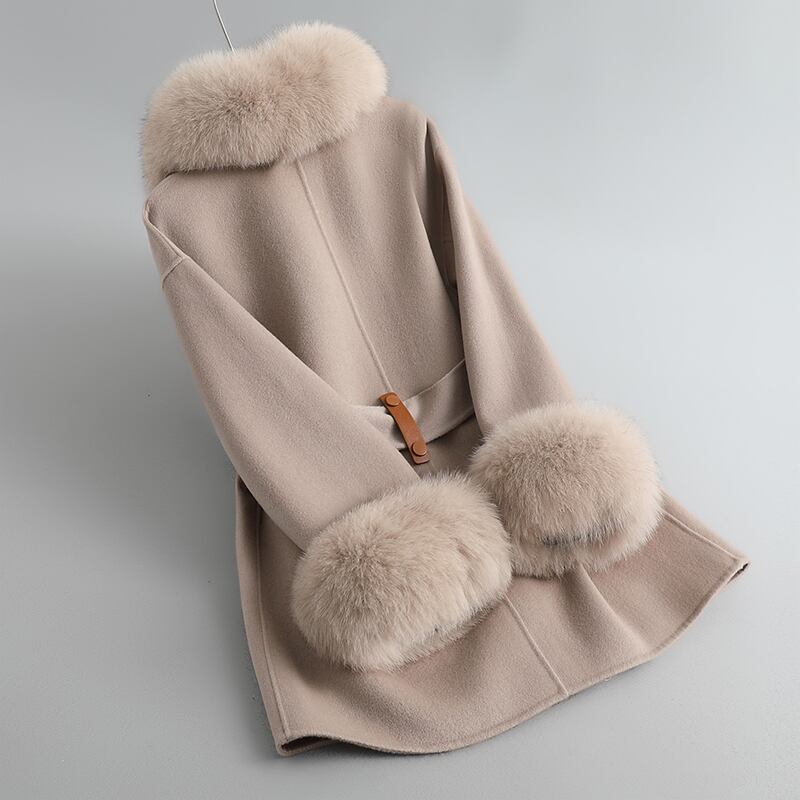 ハイエンドフォックスファーカラー両面ウールカシミアコートレディースミドル丈2023ファッションニューウールジャケットレースアップ