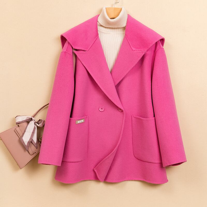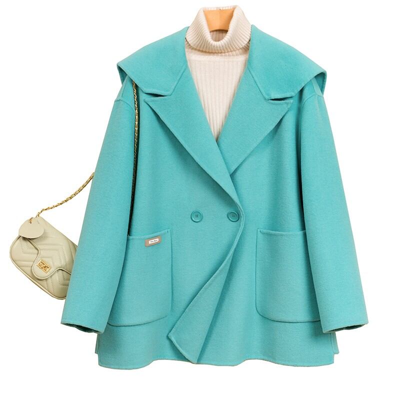 ネイビーカラー両面カシミヤコート、女性用ショートスタイル、秋冬、2023年、ニュースタイル、ルーズフィット、ハイエンドウールジャケット