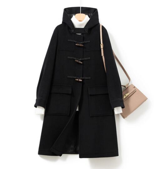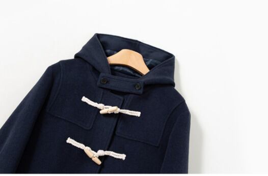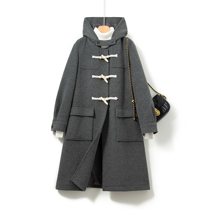 ネイビーブルーホーンボタンウールコート女性用2023年秋冬新作韓国フード付きミドル丈ハイエンドカシミヤジャケット