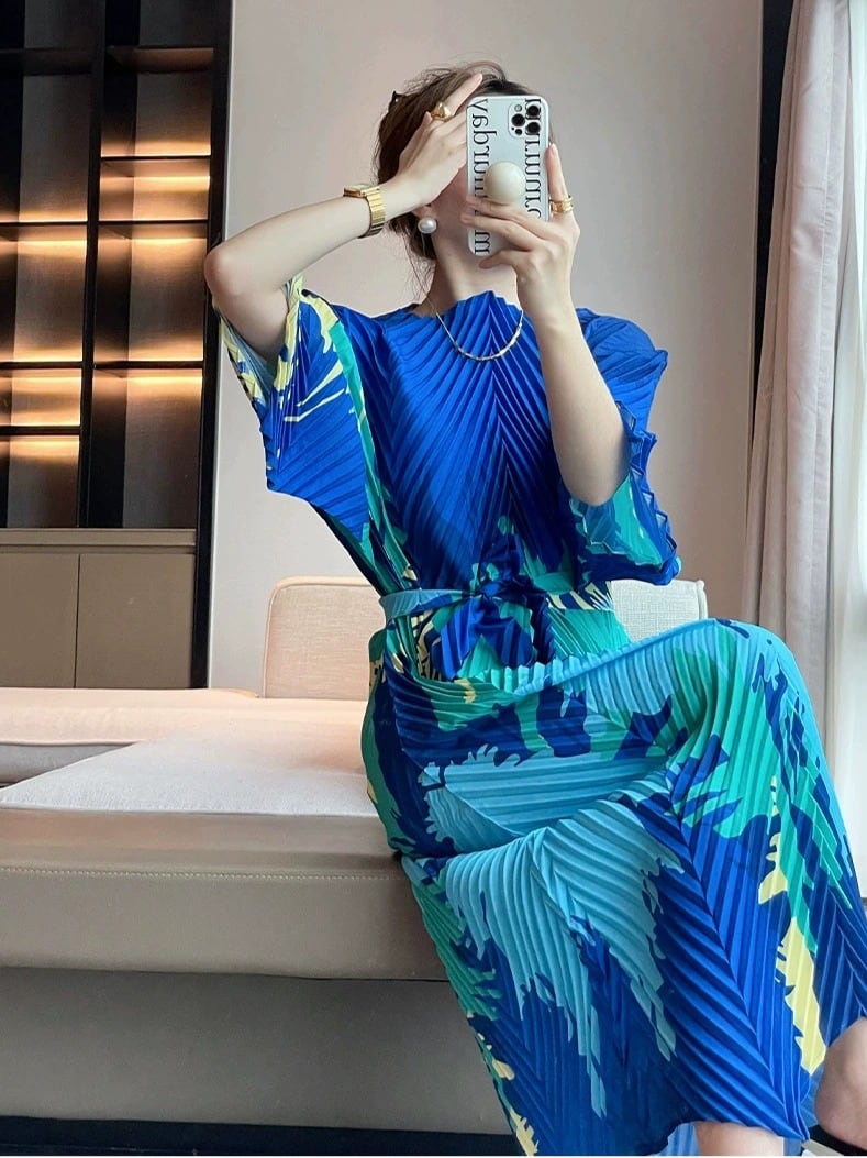 Miyakeプリントドレス、ラグジュアリー、ブルー、V字型、七分袖、プリーツ、レースアップ、ウエスト、スリムミディスカート