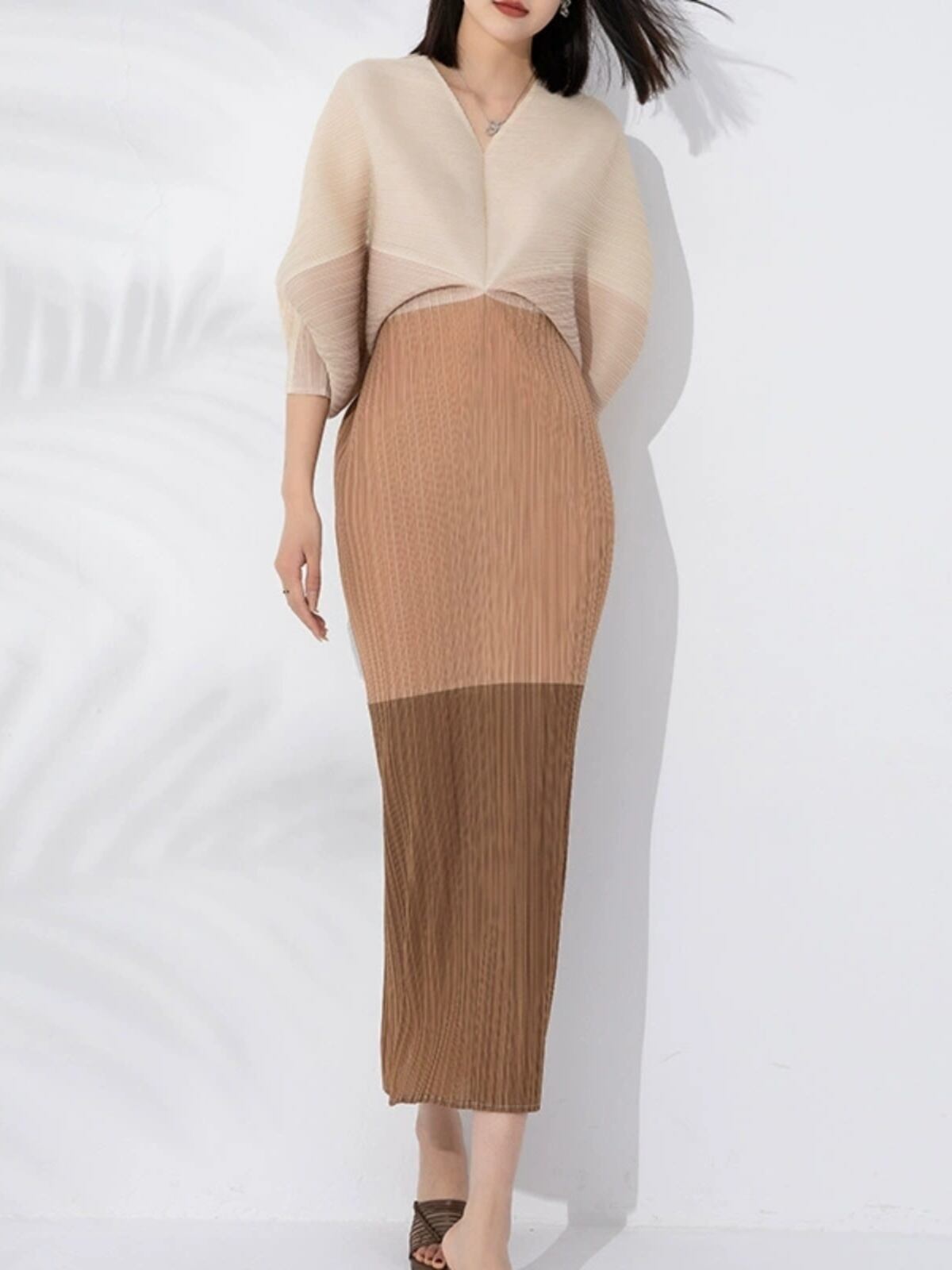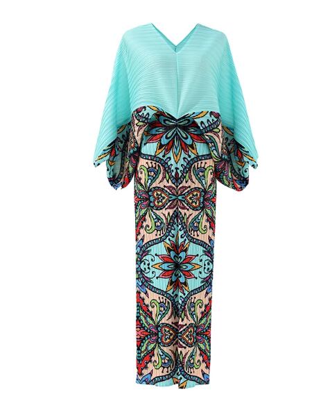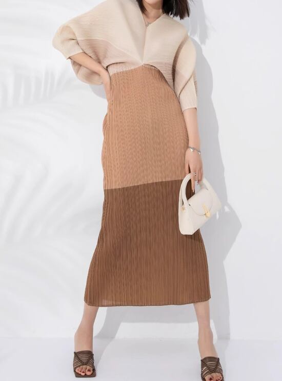 ミヤケドレス2023春夏ファッションの最新作、配色バットスリーブレトロVネックフィッシュテイルプラスサイズプリーツロングスカートが登場しました。ブルーの鮮やかな色合いが目を引く一枚は、大人の女性にぴったりのエレガントなデザインです。