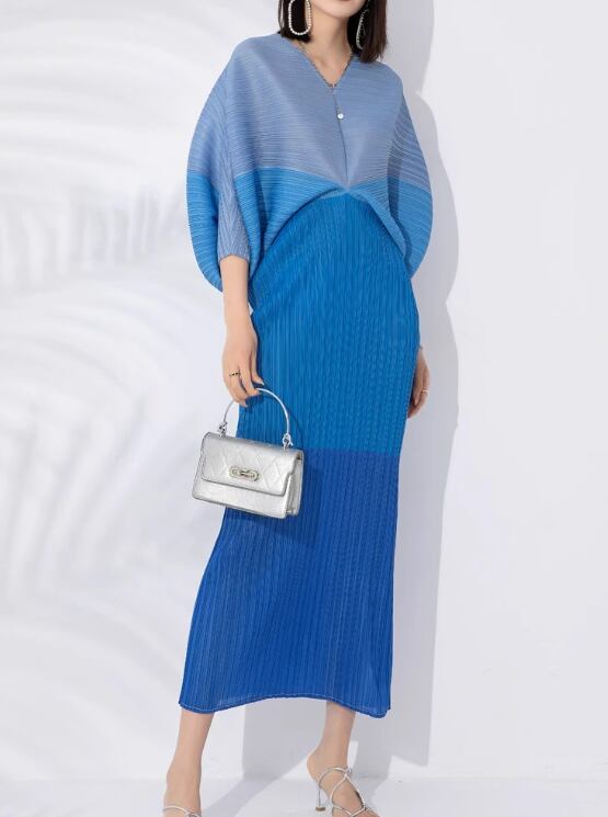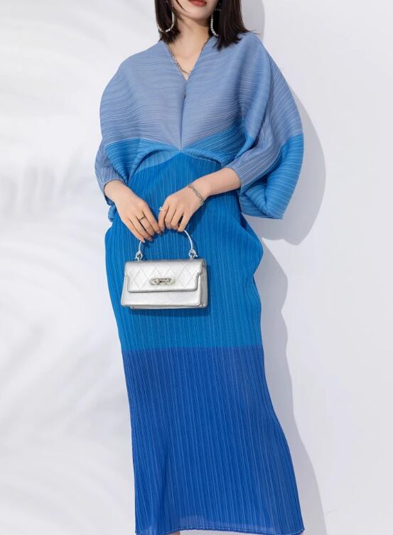 ミヤケドレス2023春夏ファッション配色バットスリーブレトロVネックフィッシュテイルプラスサイズプリーツロングスカートブルー