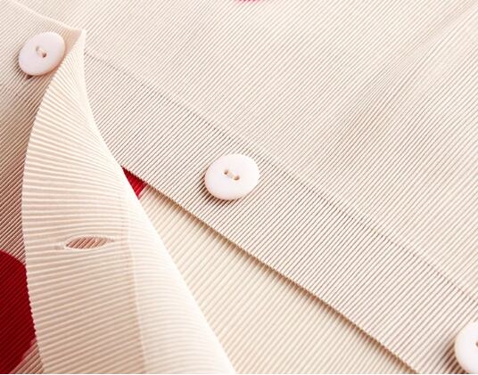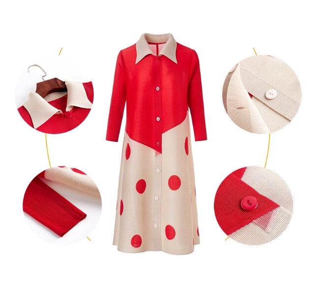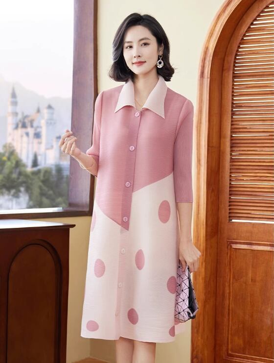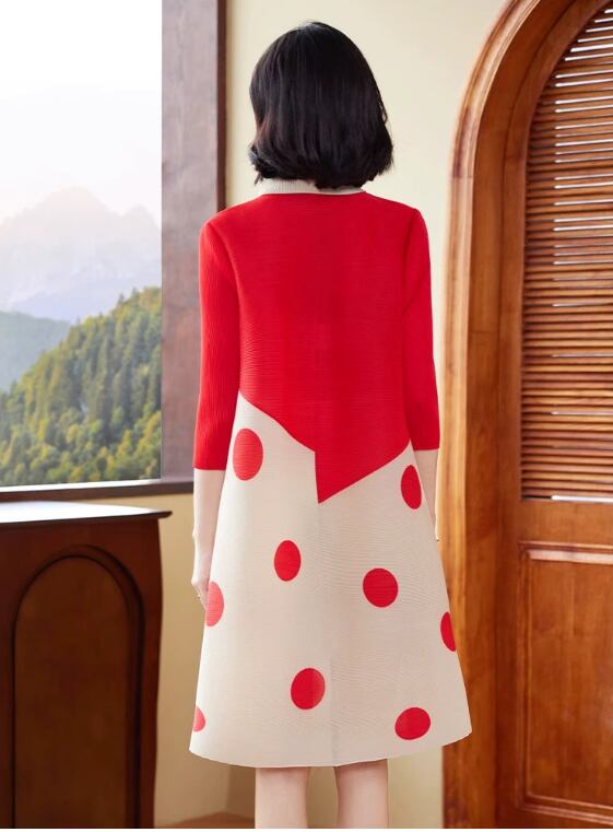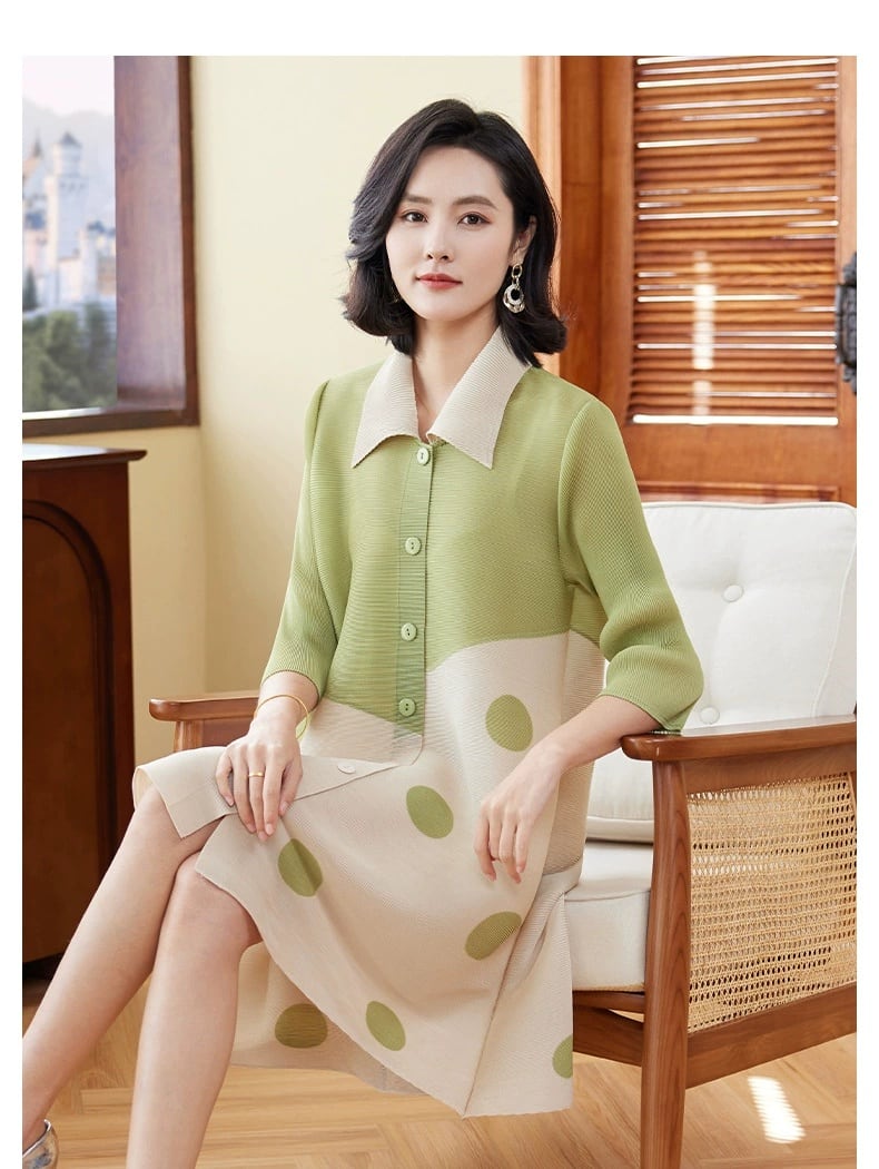 ラペルシングルブレストコントラスト水玉プリントプリーツドレス、女性通勤ファッション、ミヤケセレブ気質シャツドレス