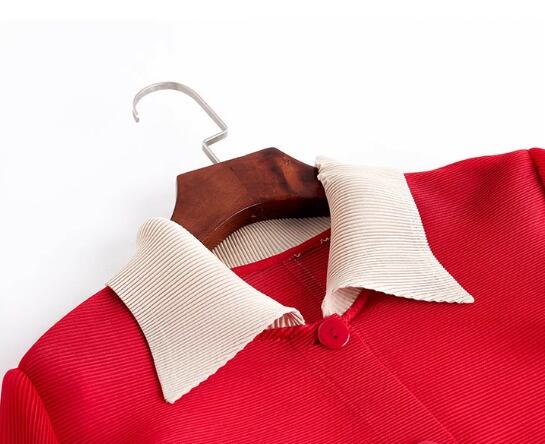 女性らしさを際立たせるラペルシングルブレストコントラスト水玉プリントプリーツドレス。通勤からデートまで幅広いシーンで活躍する一着です。洗練されたデザインと女性らしいシルエットが、ミヤケセレブ気質を演出してくれます。プリーツ加工が施されたスカートは、動くたびに揺れるたびに美しいラインを描きます。また、ウエスト部分のコントラストカラーがアクセントになって、スタイルをより引き立てます。このドレスを身に着けることで、自信を持って色々なシーンで輝いてください。