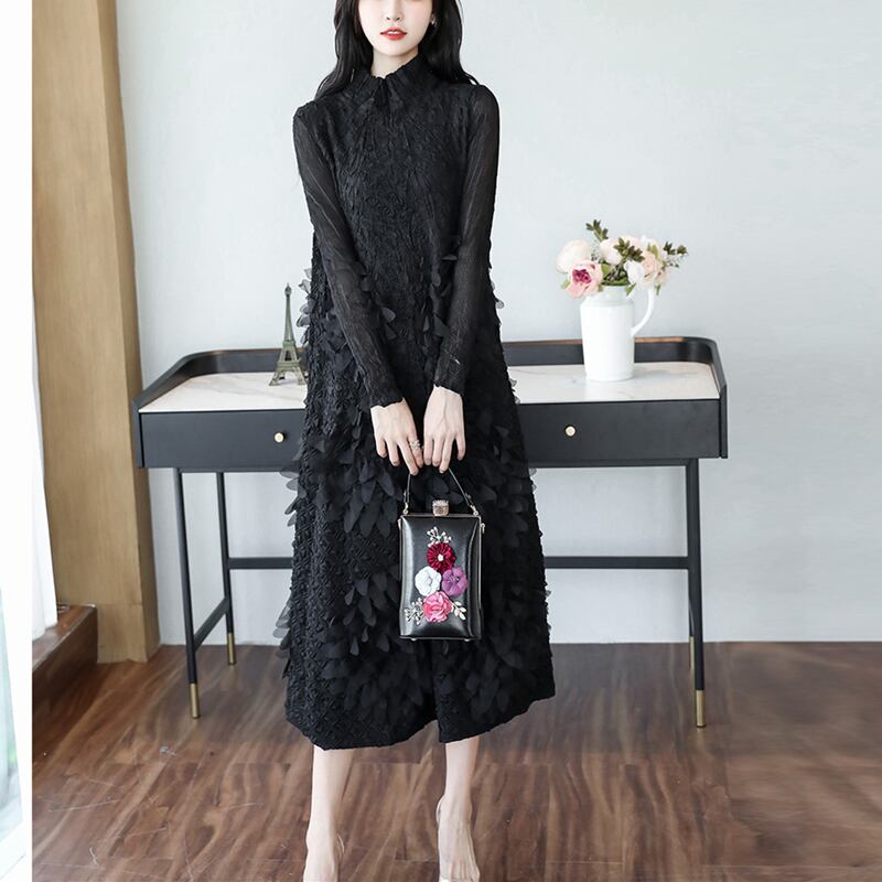 フレンチコートレトロ花びら刺繍スタンドアップカラー長袖プリーツドレス秋冬ミドル丈ドレスG164