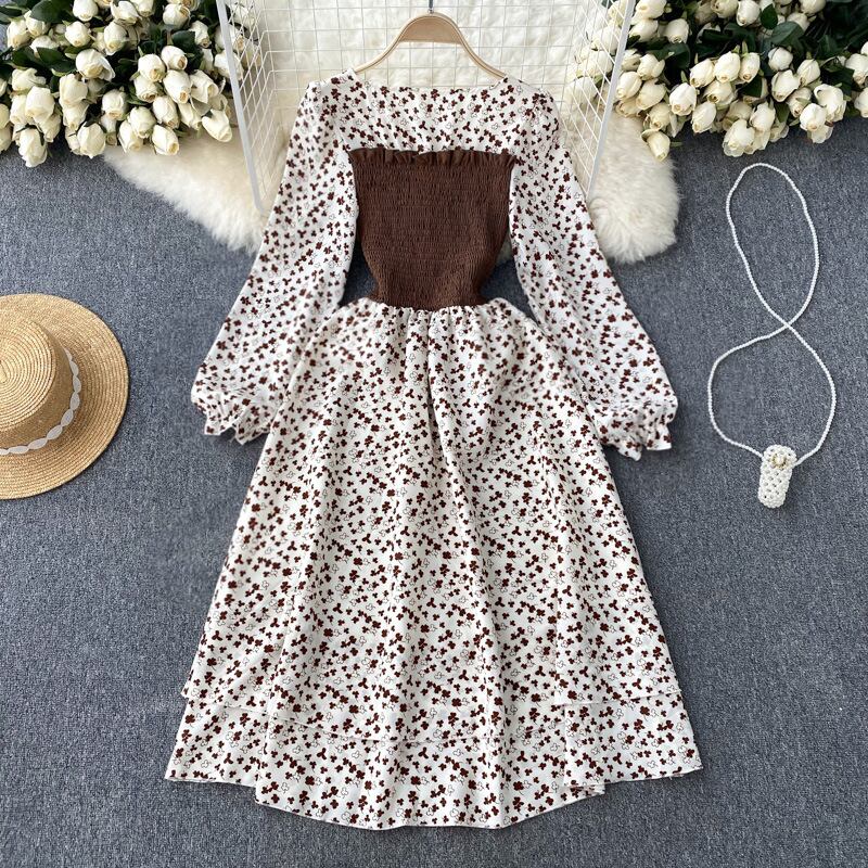 フランスの甘いデザイン感の小さい人たちは色にぶつかって偽の2つの長袖のワンピースのスカートの秋の女性の花の長いスカートの潮にぶつかります。