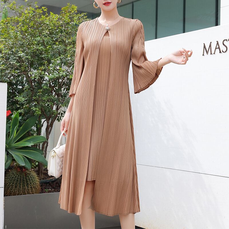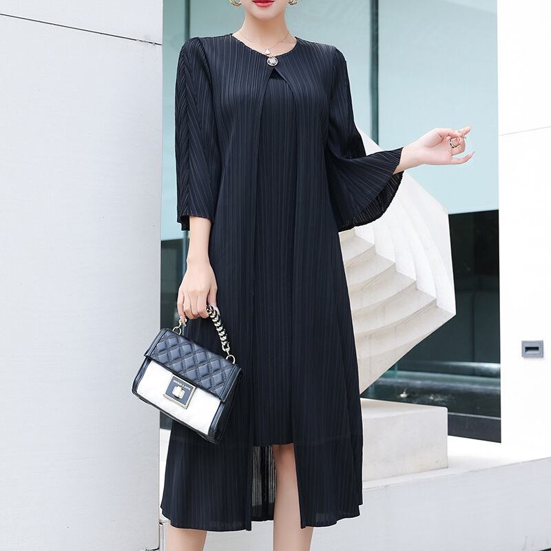 ミヤケ中高年向けプリーツドレス レディースフェイクツーピースマント風ルーズプリーツドレス