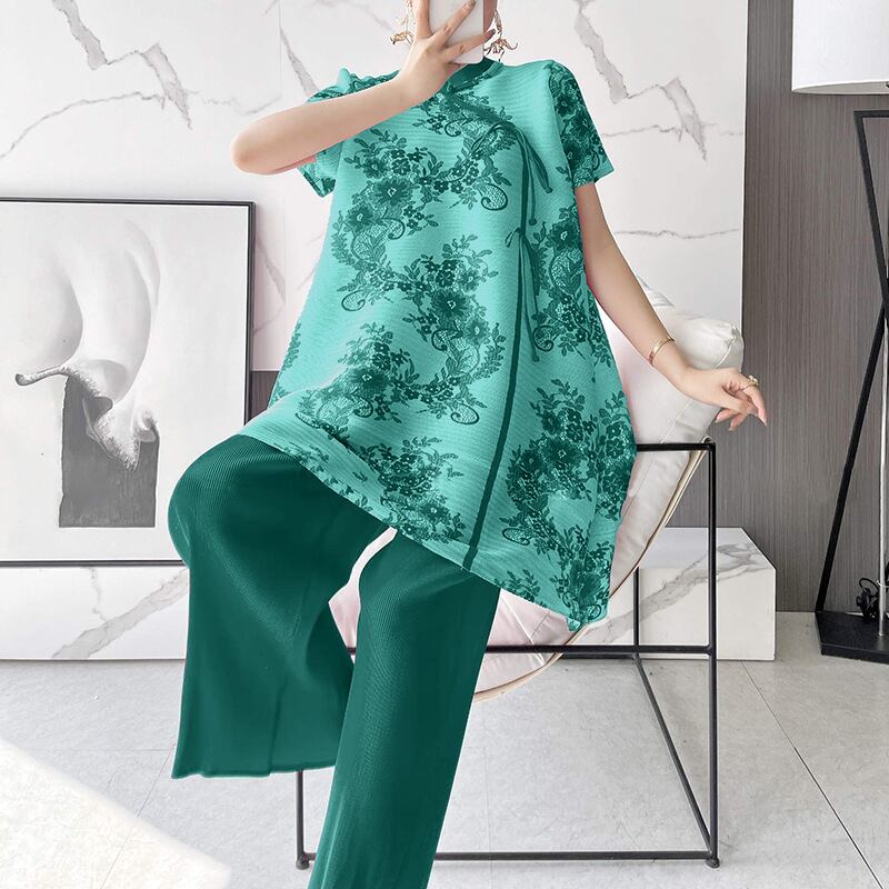 ツーピーススーツ変形チャイナドレスワイドレッグパンツプラスサイズの女性用夏用三宅プリーツドレス