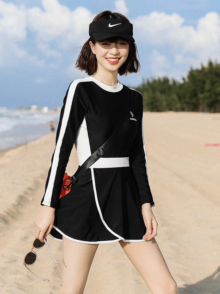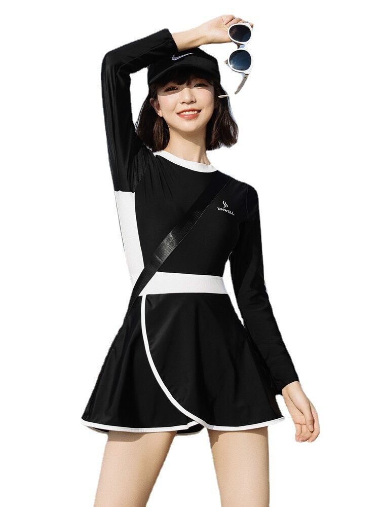 防御水着女性痩身腹カバー黒長袖水着ワンピースドロップシッピング 192