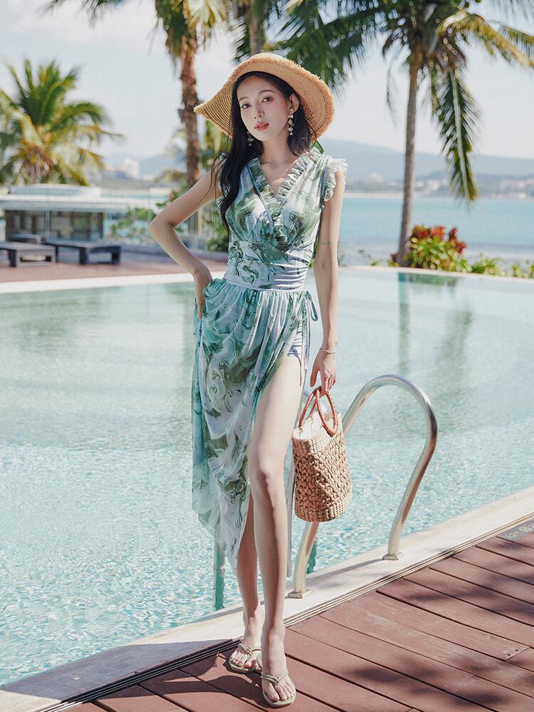 工場直販2024新作水着レディースワンピースコンサバティブ少し太った女の子の肉覆いプラスサイズグリーンスイムスーツ
