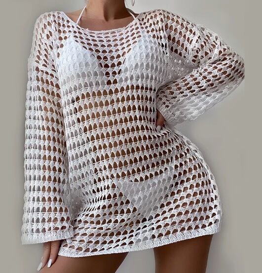 ビキニカバーアップセクシーニットホローカバーアップスカートプルオーバーラウンドネック日焼け止め長袖水着カバーアップビーチカバーアップ