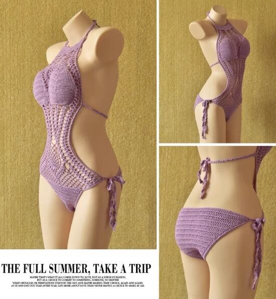 この手編み中空ホルタービキニで、あなたも目を引くビーチクイーンになりましょう!ビーチやプールサイドでの華やかなシーンを彩る一着です。